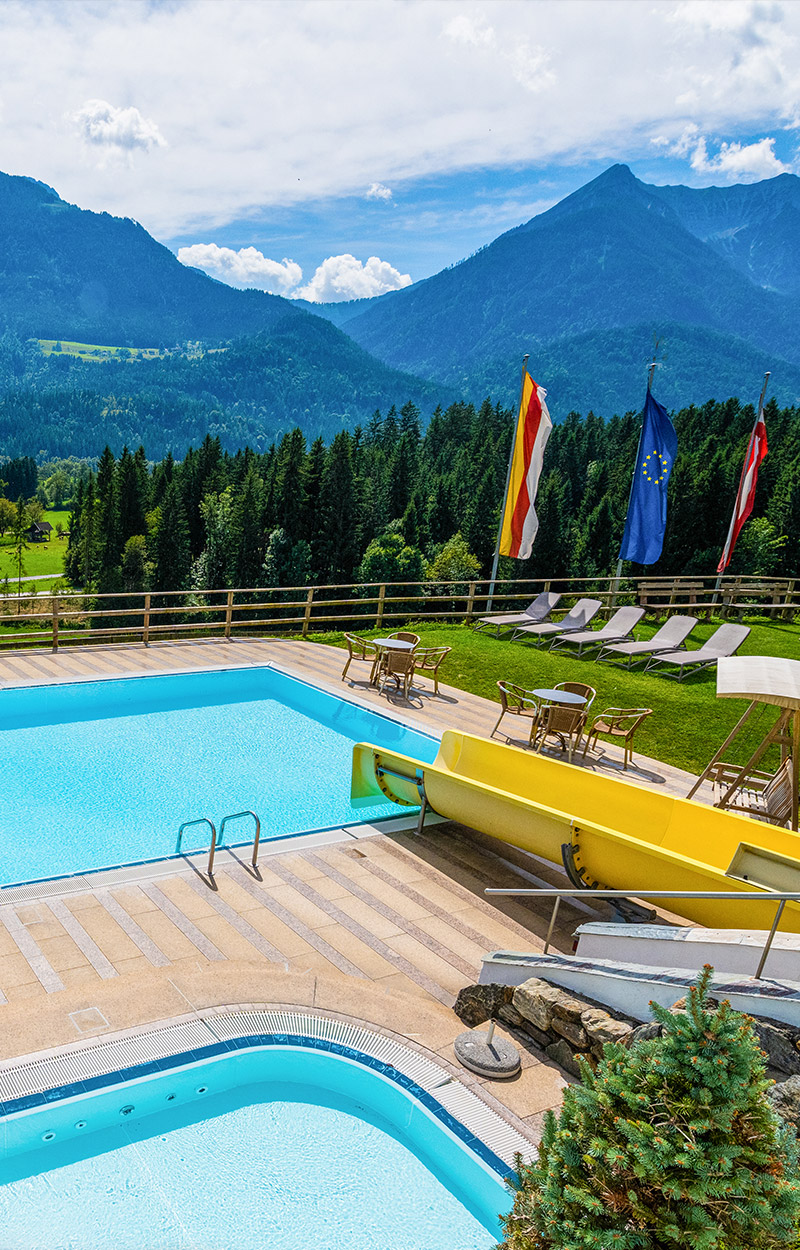 La piscina del Glocknerhof è qualcosa di speciale. Al mattino, godetevi il panorama montano e la pace e la tranquillità del sole nascente. Durante la giornata vi divertirete molto in acqua e sullo scivolo.